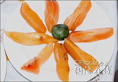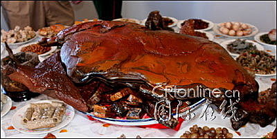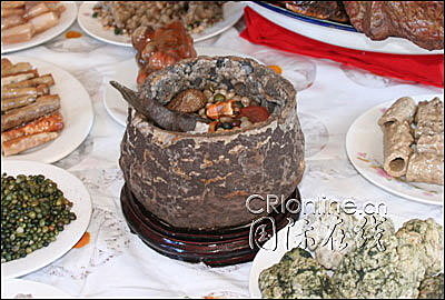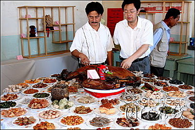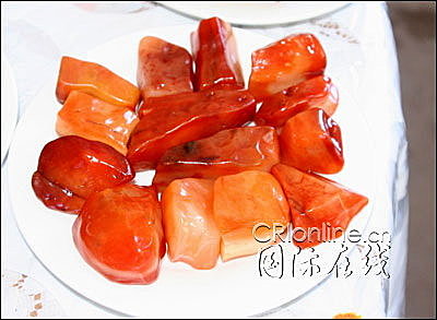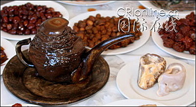 內蒙古自治區阿拉善盟是世界聞名的奇石產地,牧民納森巴亞爾根據自己的多年的石頭積累,突發靈感多方收藏組合成一桌48道菜的“蒙漢全席”,每一道菜純屬自然天成的奇石,無一人工打磨。記者仔細觀賞,未發現一絲破綻,歎為觀止。